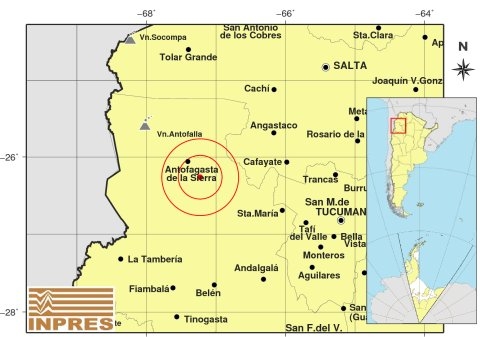 Epicentro: 211 km al O de San Miguel De Tucumán; 242 km al SO de Salta; 29 km al SE de Antofagasta De La Sierra -26.263 (lat) -67.227 (long)