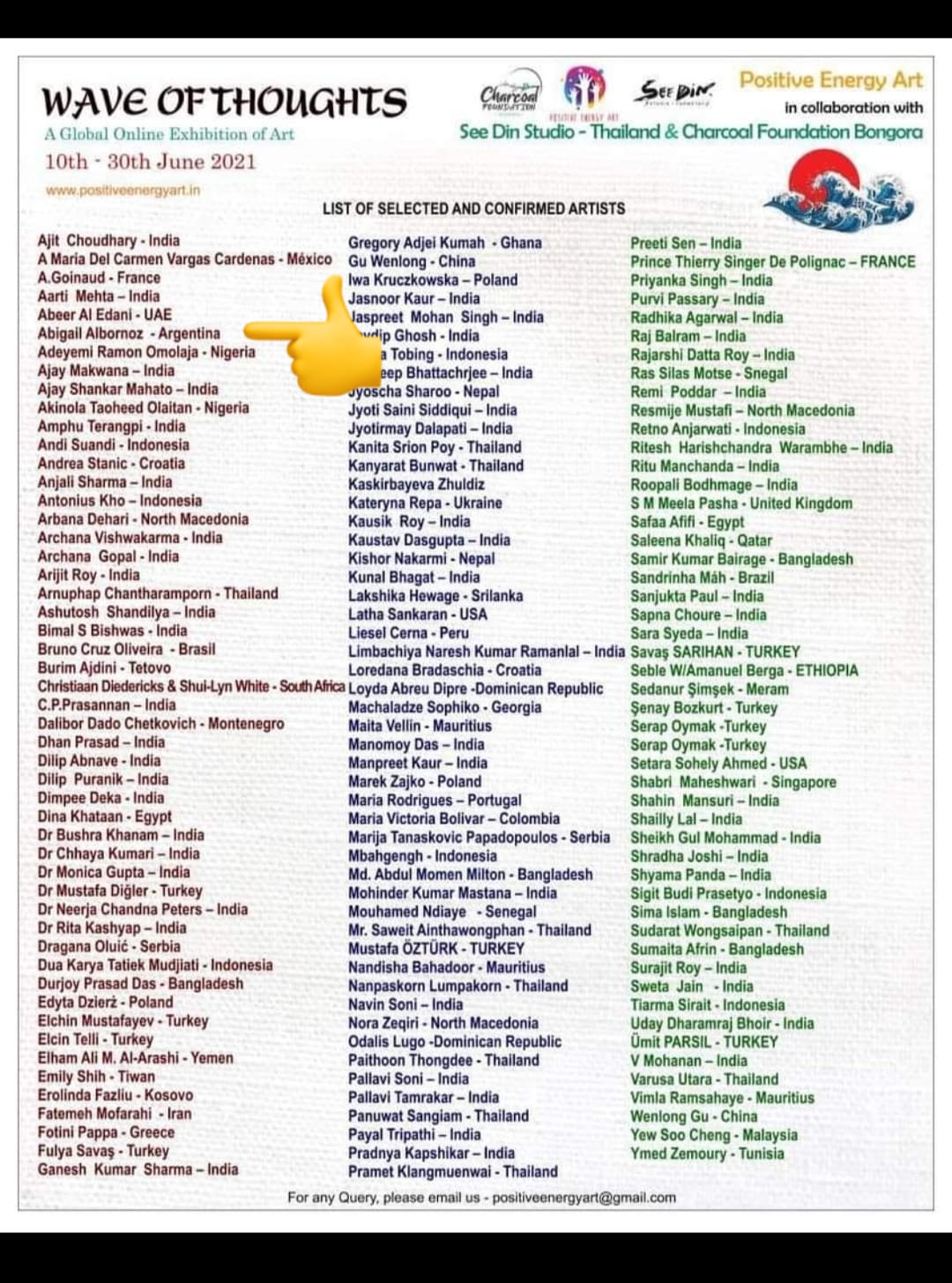 Abigail Albornoz fue seleccionada junto a 152 artistas de 35 países para la Exposición Internacional organizada por Positive Emery Art de la India denominada "Ola de Pensamiento". Será la única representante de Argentina.