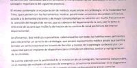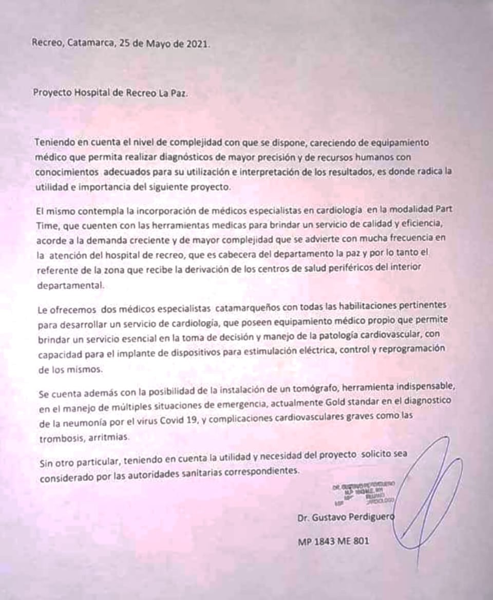 En otro tramo de la nota, Perdiguero señala que le ofrece al nosocomio "dos médicos especialistas catamarqueño con todas las habilitaciones pertinentes para desarrollar un servicio de cardiología que poseen equipamiento médico propio que permite brindar un servicio esencial en la toma de decisión y manejo de la patología cardiovascular con capacidad para el implante de dispositivos para estimulación eléctrica control reprogramación de los mismos.