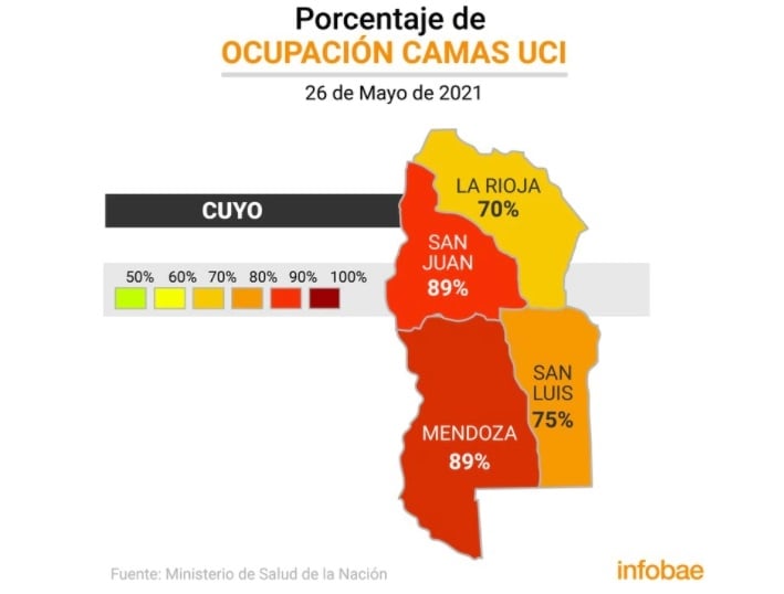 La Región Cuyo presenta a dos de las cuatro provincias que la integran en alto riesgo. Mendoza tiene el 89% de sus camas de terapia ocupadas. Allí la cantidad de infectados diarios también es muy alta. Ayer se confirmaron 907 nuevos casos.