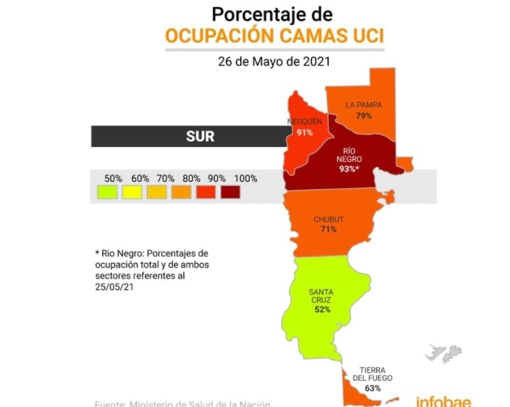 La peor de todas es Río Negro con el 93%, pero dentro de la provincia hay ciudades como Bariloche cuya capacidad de camas de terapia ya esta al 100% y se conocieron casos dramáticos de pacientes que fallecieron por no tener lugar dónde ser asistidos con respirador.