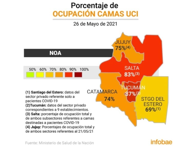 Tucumán con un 87% es la que más preocupa. Sobre todo porque si no baja la curva de casos diarios se terminará saturando. Ayer fueron confirmados 1.832 nuevos contagios.