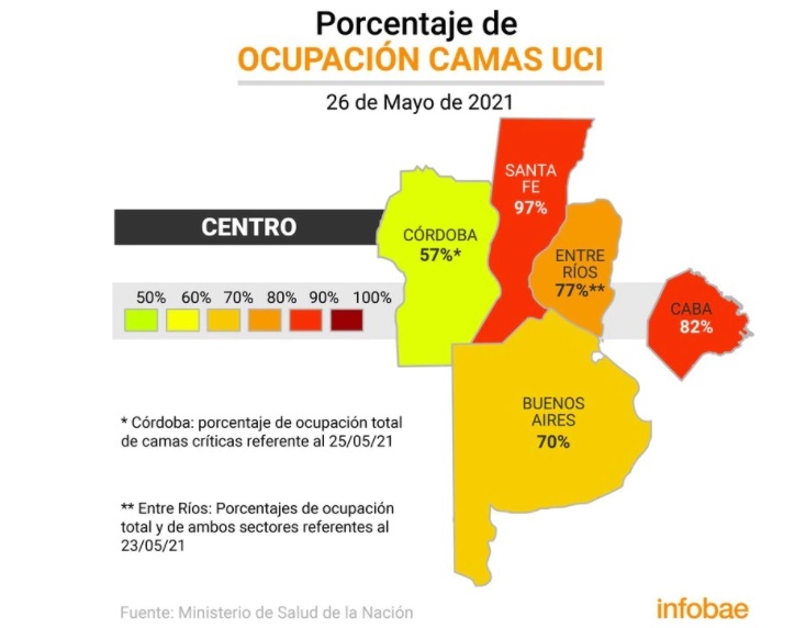 El Ministerio de Salud de la Nación observa con preocupación la ocupación de camas de las Unidades de Cuidados Intensivos públicas y privadas de todo el país, que sigue siendo muy alta -algunas están al borde de la saturación- mientras la curva de casos diarios sigue muy alta. Los porcentajes, salvo en algunas excepciones, corresponden a pacientes internados por complicaciones derivadas del COVID-19 y otras patologías. Santa Fe, Ciudad Autónoma de Buenos Aires, Mendoza, San Juan, Río Negro, Tucumán, San Juan y Neuquén, son las provincias más complicadas. A ellas hay que agregarle los distritos bonaerenses que forman parte de la región del AMBA.