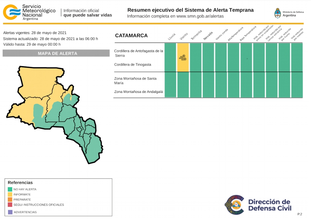 La alerta por vientos fuertes que rige para hoy viernes 28, afectando las zonas de cordillera de Antofagasta de la Sierra y cordillera De Tinogasta.