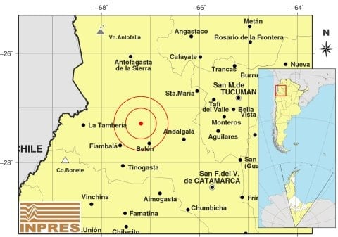 Epicentro: 192 km al NO de San F. Del Valle De Catamarca; 205 km al O de San Miguel De Tucumán; 43 km al NO de Belén -27.291 (lat) -67.194 (long)