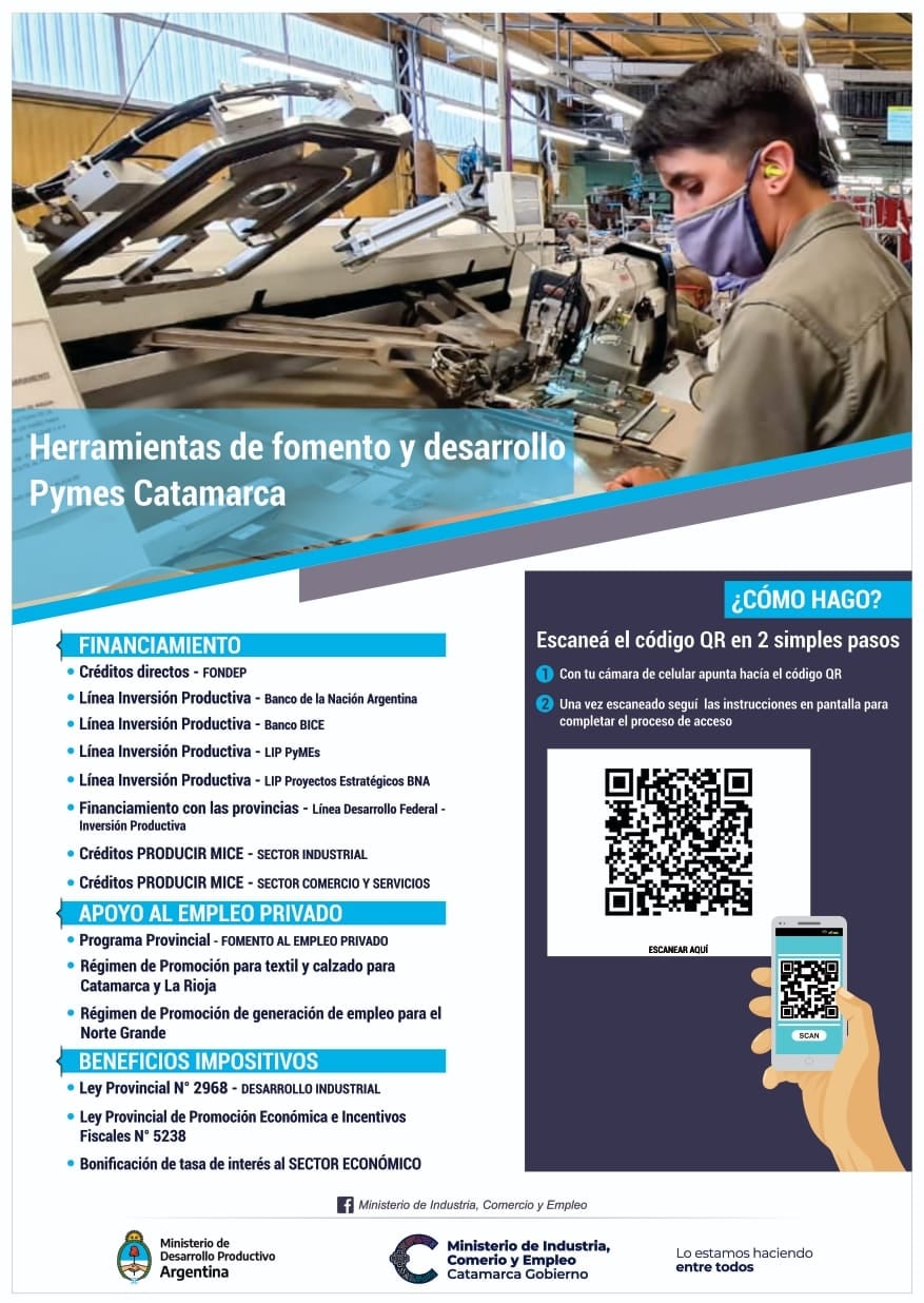 El Ministerio de Industria, Comercio y Empleo recuerda que está a disposición de los actores de la sociedad ligados al desarrollo productivo provincial, un enlace donde podrán acceder a un paquete de herramientas y programas que ofrecen la cartera provincial y el Ministerio de Desarrollo Productivo de la Nación, en el que empresarios y emprendedores locales podrán encontrar información sobre líneas de financiamiento, apoyo al empleo privado y beneficios impositivos.