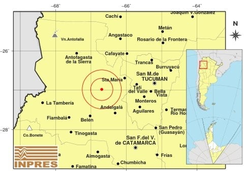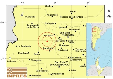 Epicentro: 150 km al O de San Miguel De Tucumán; 188 km al NO de San F. Del Valle De Catamarca; 73 km al SO de Sta.Maria -26.981 (lat) -66.695 (long)