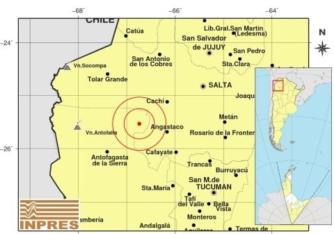 Epicentro: 155 km al SO de Salta; 209 km al SO de San Salvador De Jujuy; 51 km al O de Angastaco -25.533 (lat) -66.741 (long)