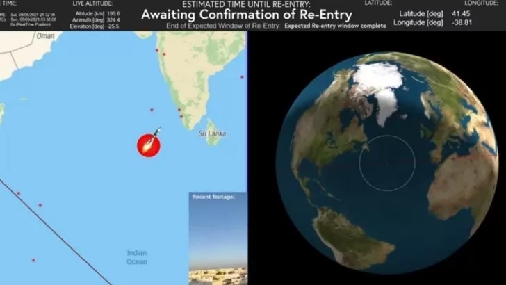 Según informa el sitio RT citando como fuentes el canal CGTN y a la la Oficina de Ingeniería Espacial Tripulada del país, partes del cohete reingresaron en la atmósfera a las 10:24 hora de Pekín (00:24 de Buenos Aires) sobre el océano Índico, al suroeste de la India y Sri Lanka: coordenadas en la longitud 72,47 grados este y la latitud 2,65 grados norte.
