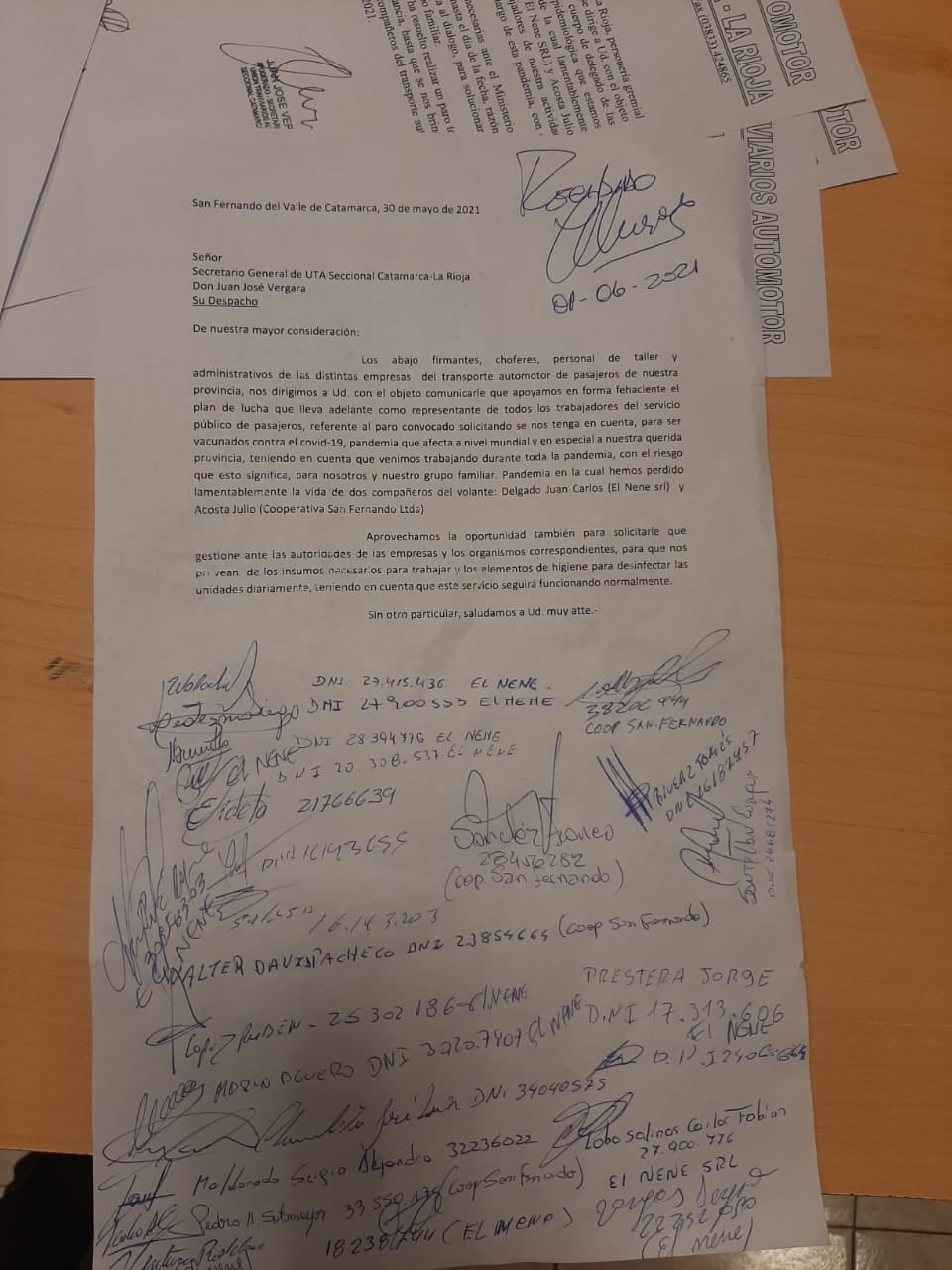 Ahora, las empresas de transporte se unieron en el pedido que viene realizando la UTA seccional Catamarca-La Rioja para pedir vacunas y lo dieron a conocer a través de una nota que fue recibida por el secretario general, Juan Vergara.