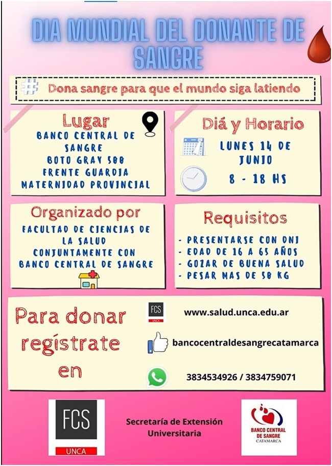 “Queremos invitar a toda la comunidad universitaria y la comunidad catamarqueña en general a participar y revalorizar su acción altruista, que le posibilita a la provincia contar y disponer con sangre de forma segura y oportuna, para ayudar a otras personas que lo necesiten” comunican desde la Facultad.