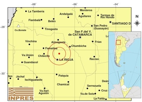 Epicentro: 24 km al N de La Rioja; 130 km al SO de San F. Del Valle De Catamarca; 64 km al SO de Chumbicha -29.154 (lat) -66.755 (long)