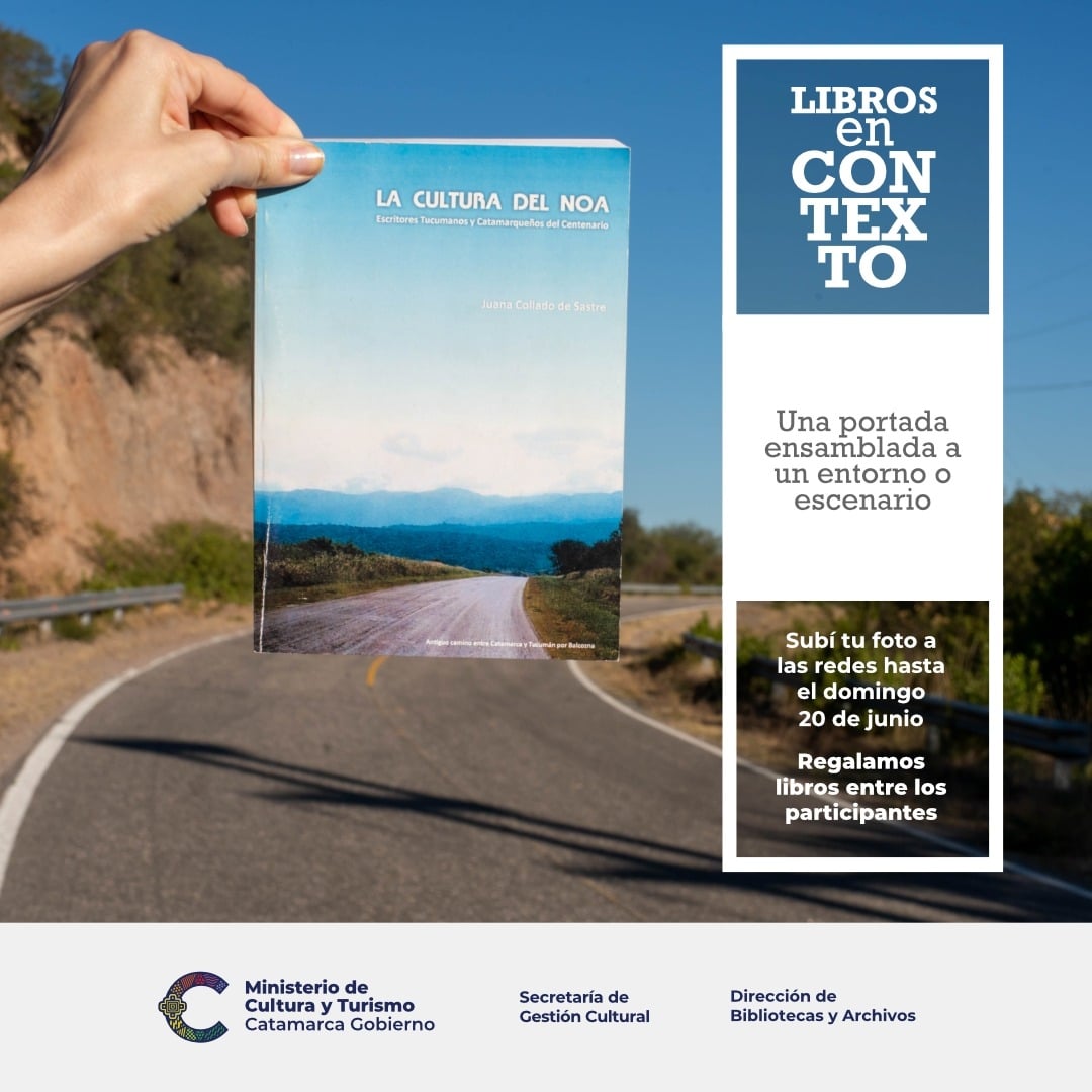 La consigna -propuesta desde la Dirección de Bibliotecas y Archivo de la Secretaría de Gestión Cultural- es elegir una tapa de libro, preferentemente de un autor catamarqueño (si no tenés, con los libros que tengas a mano) y sacarle una foto donde la imagen de la tapa se asocie con el entorno. Para ello, también se puede armar el escenario adecuado con los elementos que prefieran, de manera que la imagen del libro quede ensamblada con el fondo.