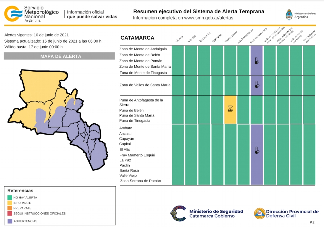Alerta por vientos zonda: La zona, será afectada por viento Zonda con velocidades entre 40 y 60 km/h, con ráfagas que pueden alcanzar los 70 km/h. Este fenómeno puede provocar reducción de la visibilidad, un repentino aumento de temperaturas y condiciones muy secas. La misma, rige desde HOY miércoles 16 hasta el día VIERNES 18 afectando las zonas de; PUNA DE ANTOFAGASTA DE LA SIERRA, DE BELÉN, DE SANTA MARÍA Y TINOGASTA.