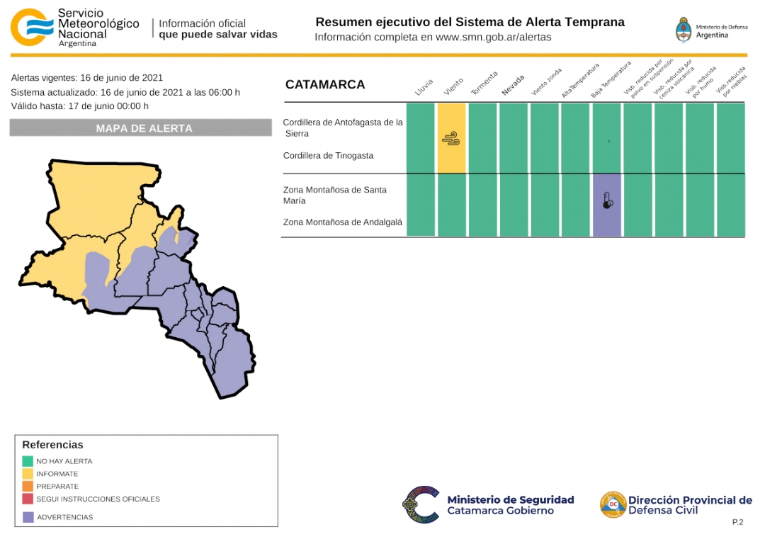 Alerta por vientos: El área será afectada por vientos del sector oeste con velocidades entre 70 y 80 km/h con ráfagas que pueden alcanzar hasta 90 km/h. La misma, rige para hoy miércoles 16 hasta el día viernes 18 afectando las zonas de, CORDILLERA DE ANTOFAGASTA DE LA SIERRA Y CORDILLERA DE TINOGASTA.