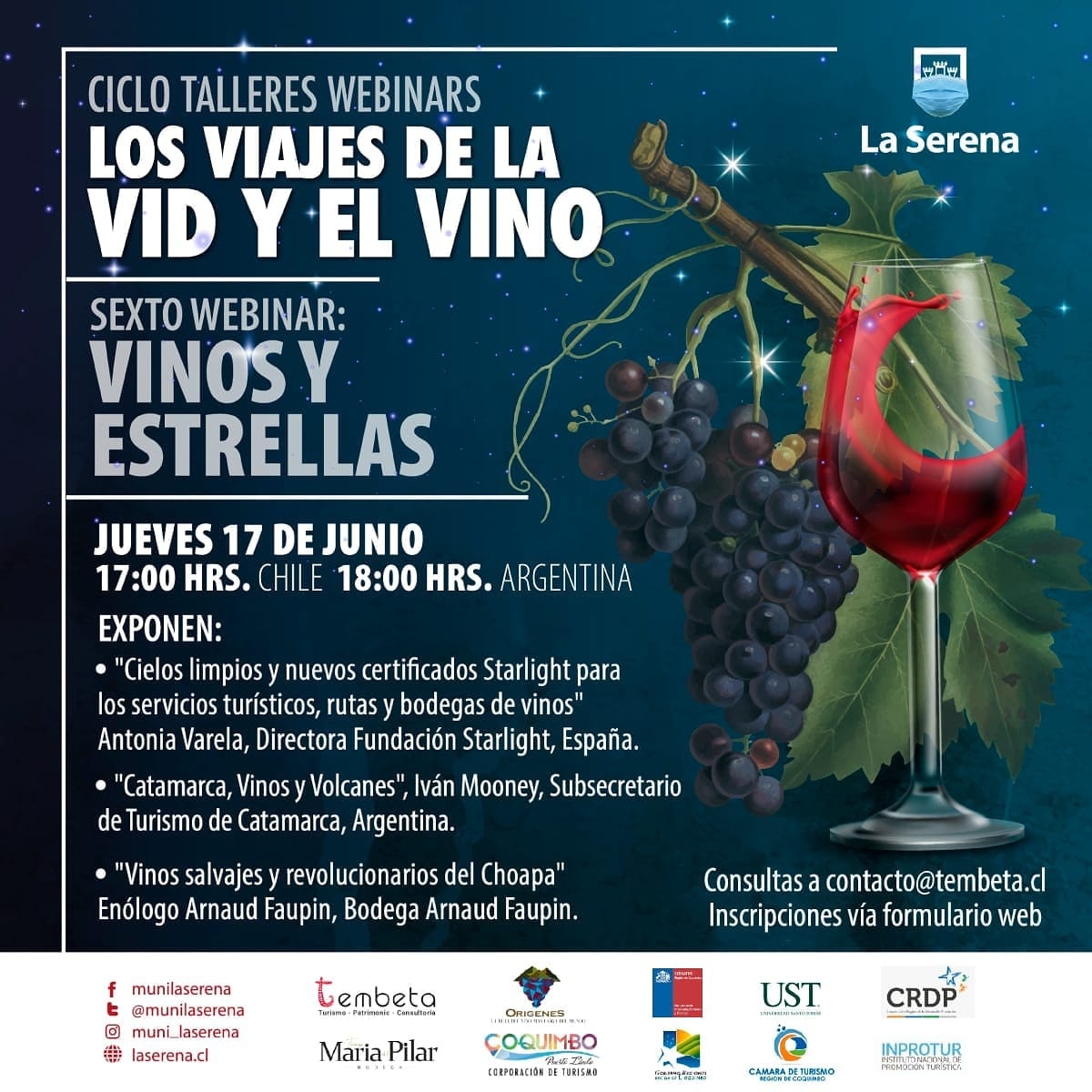 Se trata del Ciclo de Talleres Webinars “Los viajes de la vid y el vino”, en su sexta edición denominada “Vinos y Estrellas” que se desarrollará hoy jueves 17 de junio, desde las 18 horas de la Argentina, donde expondrán la Directora de la Fundación Starlight de España, Antonia Varela, sobre, “Cielos limpios y nuevos certificados Starlight para los servicios turísticos, rutas y bodegas de vinos”.