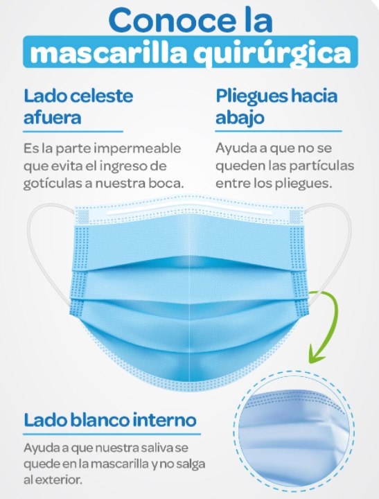 - La capa celeste (o verde) del barbijo siempre debe ir hacia fuera, dado que ese filtro es una barrera que repele los fluidos. Además, el mismo debe cubrir desde la barbilla hasta la nariz en todo momento.