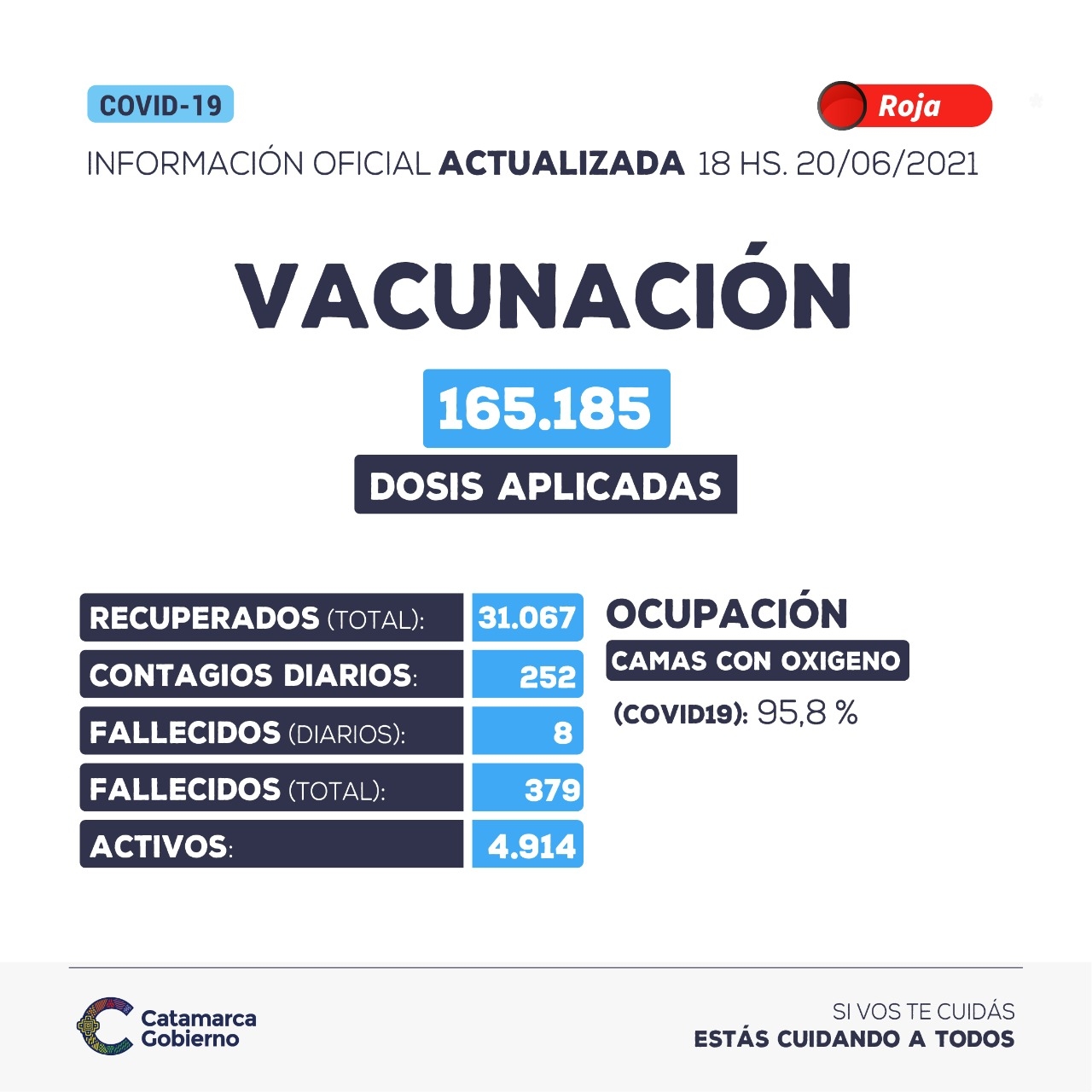 En cuanto al avance de la campaña de vacunación para COVID-19 en Catamarca, el Ministerio de Salud detalla que hasta el día 20 de junio se aplicaron 165.185 y que las mismas fueron aplicadas a un total de 130.123 personas (Fuente: NOMIVAC).