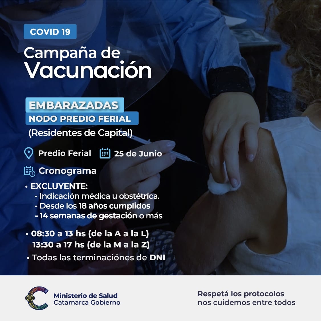 El secretario de Medicina Preventiva, indicó que “para mayor comodidad y, sobre todo, para que no tenga contacto con otras personas, la vacunación será el día viernes 25 de junio el Predio Ferial, exclusivo para las embarazadas, para que puedan concurrir con tranquilidad”.