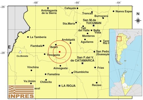 Epicentro: 121 km al NO de San F. Del Valle De Catamarca; 161 km al N de La Rioja; 39 km al SE de Belén -27.961 (lat) -66.841 (long)