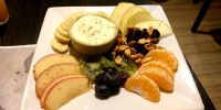 Rodajitas en juliana de frutas de estación formando una media luna: banana, pera, mandarina y manzana acompañadas con arándanos, kiwi y frutos secos. Entre ellos, nueces, pasa de uva, almendras maní y pasitas de uva blanca cubriendo la otra mitad del círculo que es coronado en el centro con un pocillo con queso untable fresco, riquísimo!