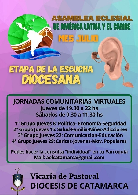 También se puede realizar esta consulta de modo individual, ingresando a la página de la Asamblea Eclesial de América Latina y el Caribe: https://asambleaeclesial.lat/, o mediante la “consulta individual” por escrito, que se envió a las parroquias, o también a través del mail de la organización de la Diócesis de Catamarca: [email protected].