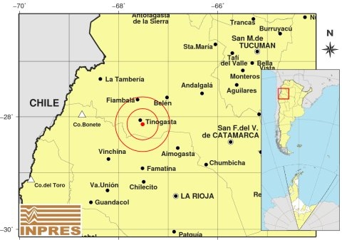 Epicentro: 156 km al NO de La Rioja; 178 km al O de San F. Del Valle De Catamarca; 9 km al SE de Tinogasta -28.134 (lat) -67.516 (long)