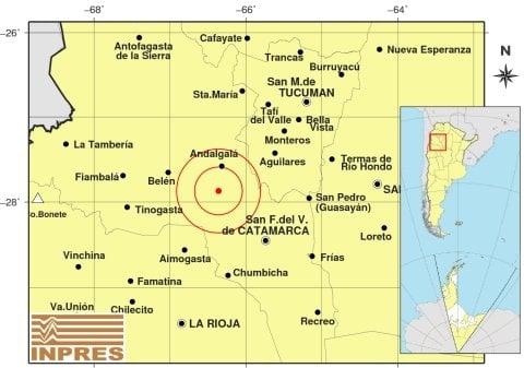 Epicentro: 108 km al NO de San F. Del Valle De Catamarca; 164 km al N de La Rioja; 47 km al SE de Belén -27.935 (lat) -66.668 (long)