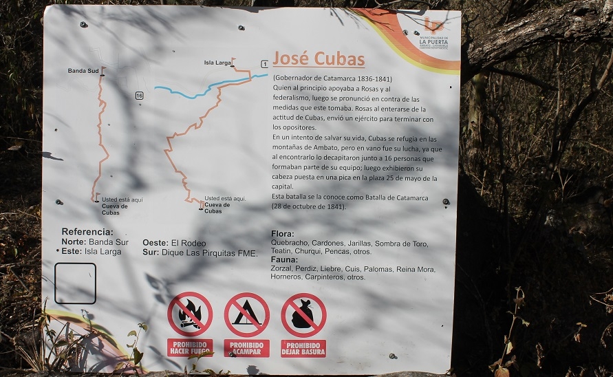 “Dispuesto a defender cara su vida, Cubas se fortificó en Catamarca zanjando sus calles, porque era imposible escapar. Balboa y Maza lo atacaron el 29 de octubre. Cubas fue encontrado cinco días después oculto en las inmediaciones (en esta cueva de La Puerta) y, llevado a la ciudad, se lo degolló (5 de noviembre). La misma suerte corrieron su ministro Dulce y sus comandantes y oficiales”.