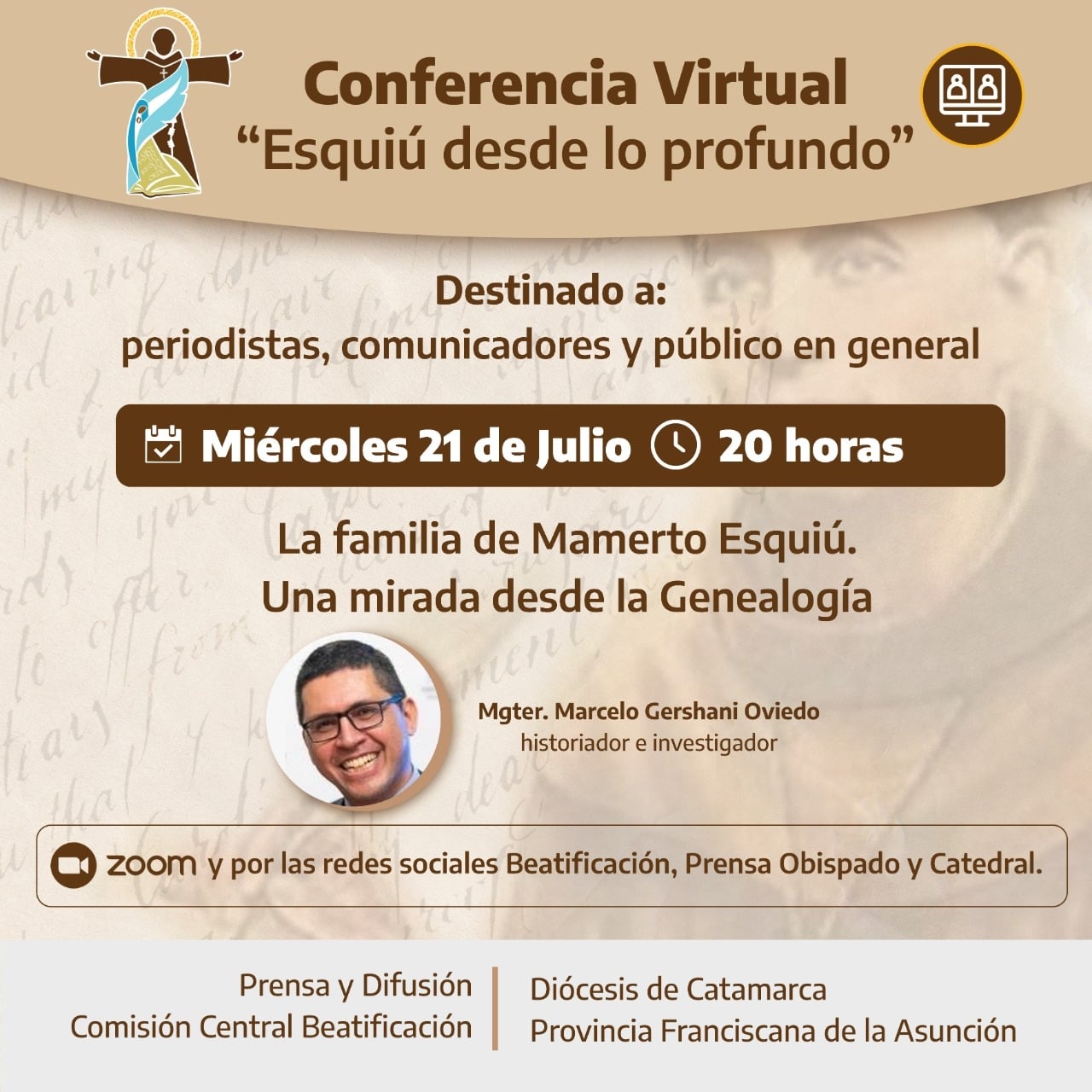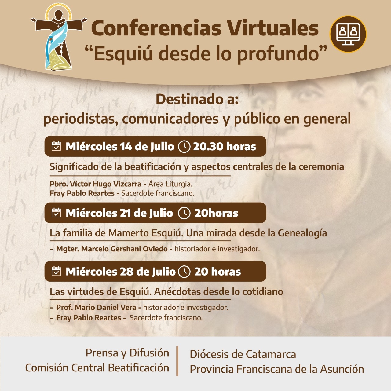 Esta propuesta del Área de Prensa y Difusión de la Comisión organizadora de la Beatificación de Esquiú se realiza durante tres miércoles consecutivos de julio, a través de la plataforma zoom y con transmisión en vivo por las redes sociales Beatificación FME y Prensa Obispado Catamarca.