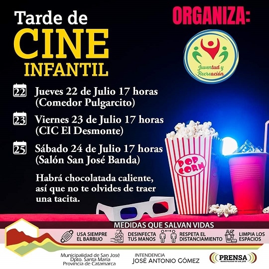 "Son tardes de cine infantil para todos los niños. El jueves iniciamos en el Comedor Pulgarcito a las 17:00 hs, el viernes en el CIC de El Desmonte y el sábado en el salón parroquial de San José Banda, a las 17:00 hs.