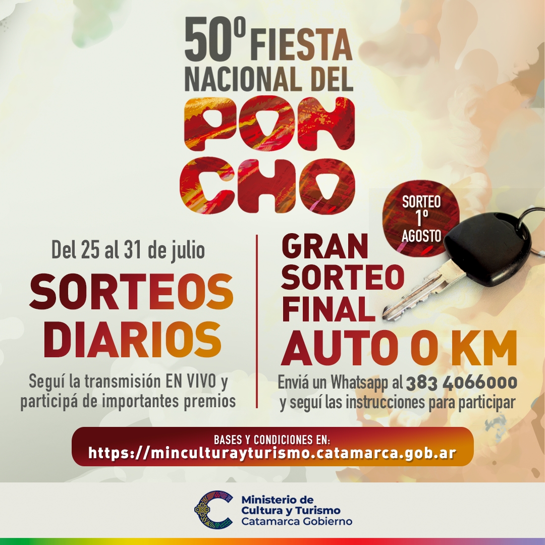 Durante cada jornada de la 50º edición de la Fiesta Nacional del Poncho, se realizarán cinco (5) sorteos diarios, en el transcurso de la transmisión del festival virtual, entre las 19 y 22 hs.