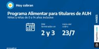 En el marco del Plan Argentina contra el Hambre del Ministerio de Desarrollo Social, la ANSES acompaña con el pago del programa Alimentar. Hoy cobran titulares de la AUH con hijos e hijas de 0 a 14 años inclusive con documentos concluidos en 2 y 3, que no poseen la tarjeta plástica y reciben el dinero en la misma cuenta de la prestación.