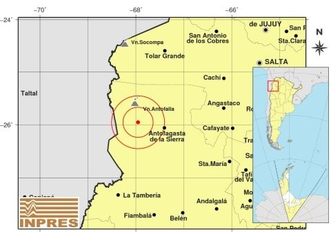 Epicentro: 284 km al SO de Salta; 291 km al O de San Miguel De Tucumán; 57 km al O de Antofagasta De La Sierra -25.954 (lat) -67.955 (long)