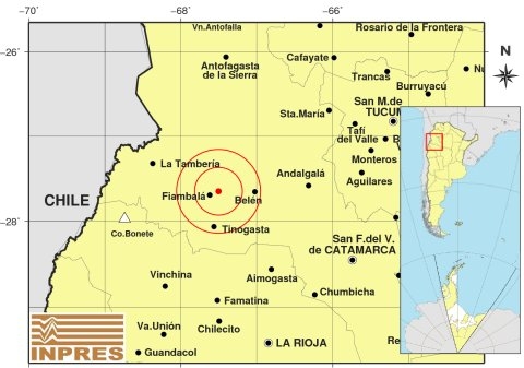 Epicentro: 195 km al NO de San F. Del Valle De Catamarca; 206 km al N de La Rioja; 12 km al NE de Fiambalá -27.647 (lat) -67.503 (long)