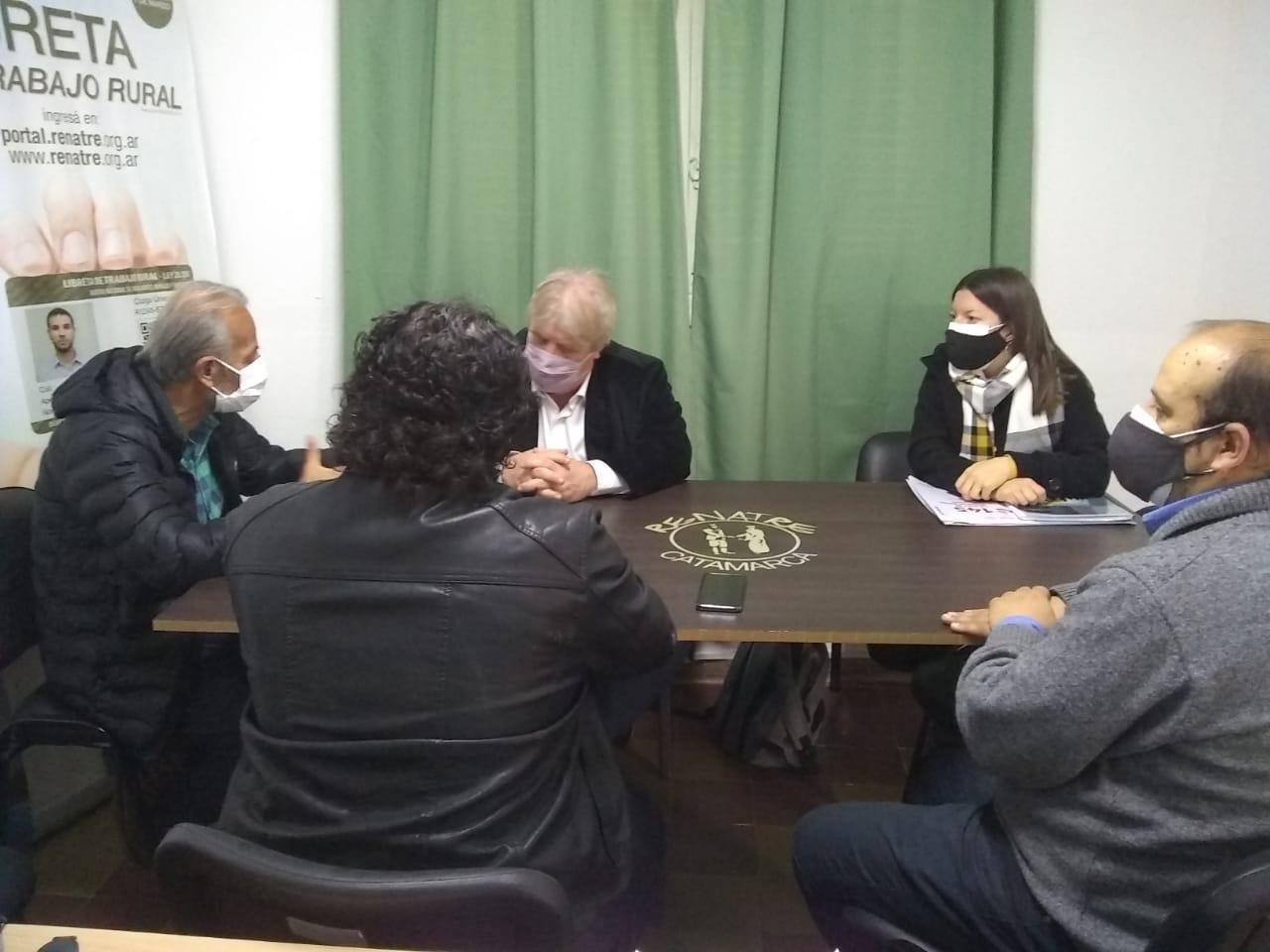 El delegado del Registro Nacional de Trabajadores Rurales y Empleadores (RENATRE) en Catamarca, Enrique Cowes, mantuvo una reunión con el director del Comité Ejecutivo de Lucha en contra de la Trata y Explotación de Personas y para la protección y asistencia a sus víctimas, Gustavo Vera, con el delegado Regional del Comité en el NOA, Rodrigo Pérez, y la delegada de Lucha contra la Trata en Catamarca, Ivana Monferrán Contreras.