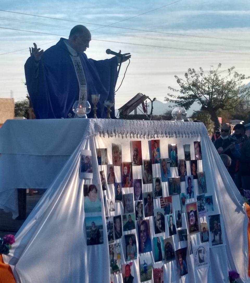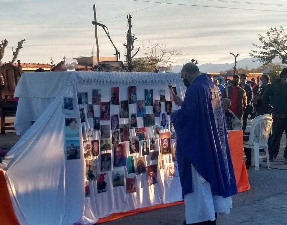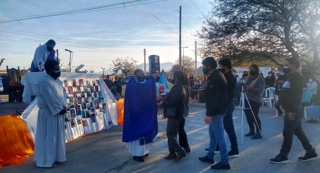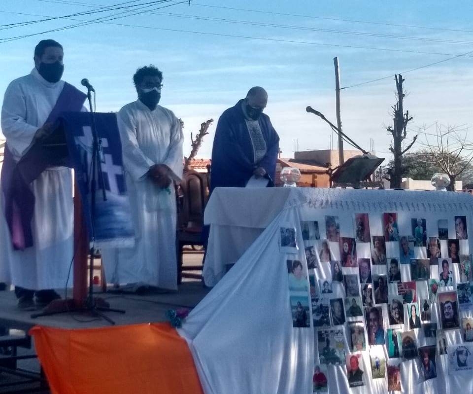 El pasado viernes 23 de julio, se celebró la Santa Misa, presidida por el párroco, Pbro. Javier Grosso, en el ingreso al cementerio de la Ciudad de Belén. En este lugar se levantó el altar, alrededor del cual se colocaron imágenes con los rostros de algunas de las personas que murieron a raíz de esta enfermedad.