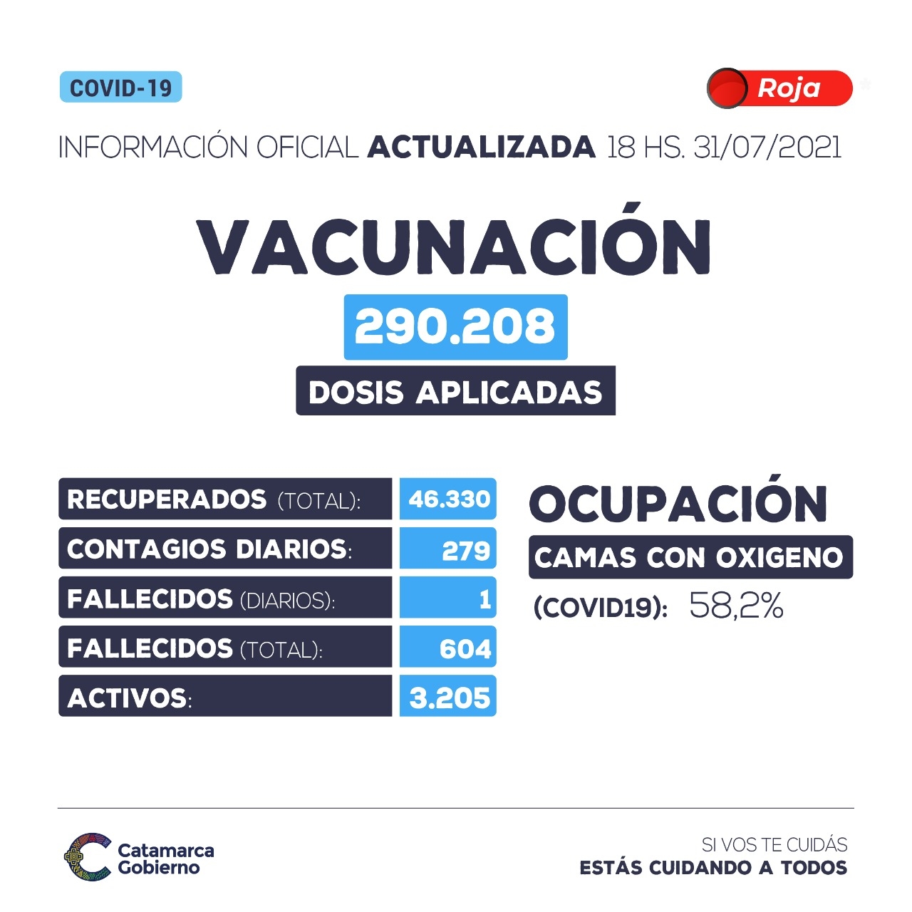 En cuanto al avance de la campaña de vacunación para COVID-19 en Catamarca, el Ministerio de Salud detalla que hasta el día 31 de julio se aplicaron 290.208 y que las mismas fueron aplicadas a un total de 235.931 personas (Fuente: NOMIVAC).