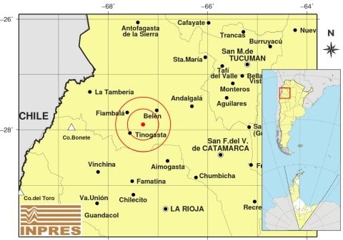 Epicentro: 165 km al O de San F. Del Valle De Catamarca; 173 km al N de La Rioja; 31 km al NE de Tinogasta -27.907 (lat) -67.300 (long)