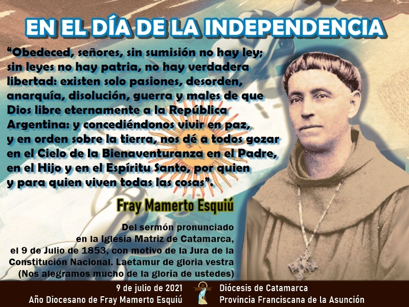 “Para que la enseñanza del respeto, de la sumisión y de la obediencia se perpetuara en la memoria de los pueblos y se encarnara en el corazón de los individuos, el Vicepresidente expidió el siguiente decreto: Paraná, 2 de mayo de 1854. “…Considerando que importa al crédito moral y literario de las Provincias Argentinas, que las revelaciones de la doctrina del Padre Esquiú alcancen una grande circulación con el objeto de uniformar las creencias políticas y religiosas de un país, que debe tantas desgracias al error. Ha acordado y decreta: Art. 1° - Hágase con esmerada corrección y limpieza una impresión separada del discurso y remítanse en números suficientes al autor y a todas las autoridades civiles y eclesiásticas de la Confederación. 3°- Solicítese igualmente del gobierno de Catamarca una noticia autobiográfica del R. P. Fray Mamerto Esquiú y felicítele por el venero de purísimo oro, descubierto en la potente inteligencia de un miembro ignorado del humilde claustro de San Francisco en aquella provincia; porque el Gobierno como la Confederación pueden decir también con este motivo: Laetamur de gloria vestra. 4° - Comuníquese, publíquese y dese al Registro Nacional”. Firman este decreto el doctor Salvador María del Carril y el doctor José Benjamín Gorostiaga, Ministro del Interior” -extraído de la Reseña biográfica de Fray M. Esquiú, de Fray Mamerto González-.