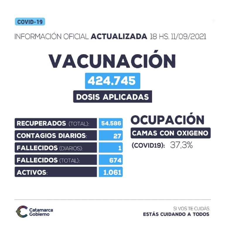 En cuanto al avance de la campaña de vacunación para COVID-19 en Catamarca, el Ministerio de Salud detalla que hasta el día 11 de septiembre se aplicaron 424.745 y que las mismas fueron aplicadas a un total de 290.963 personas (Fuente: NOMIVAC).
