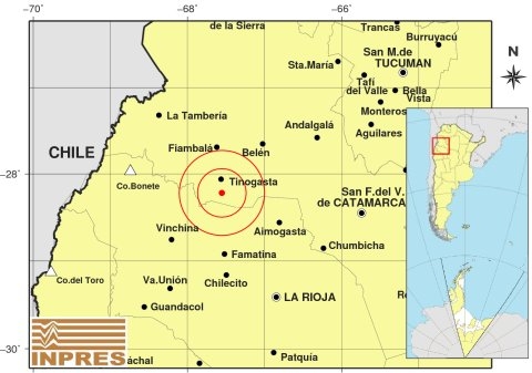 Epicentro: 149 km al NO de La Rioja; 180 km al O de San F. Del Valle De Catamarca; 18 km al S de Tinogasta -28.219 (lat) -67.553 (long)