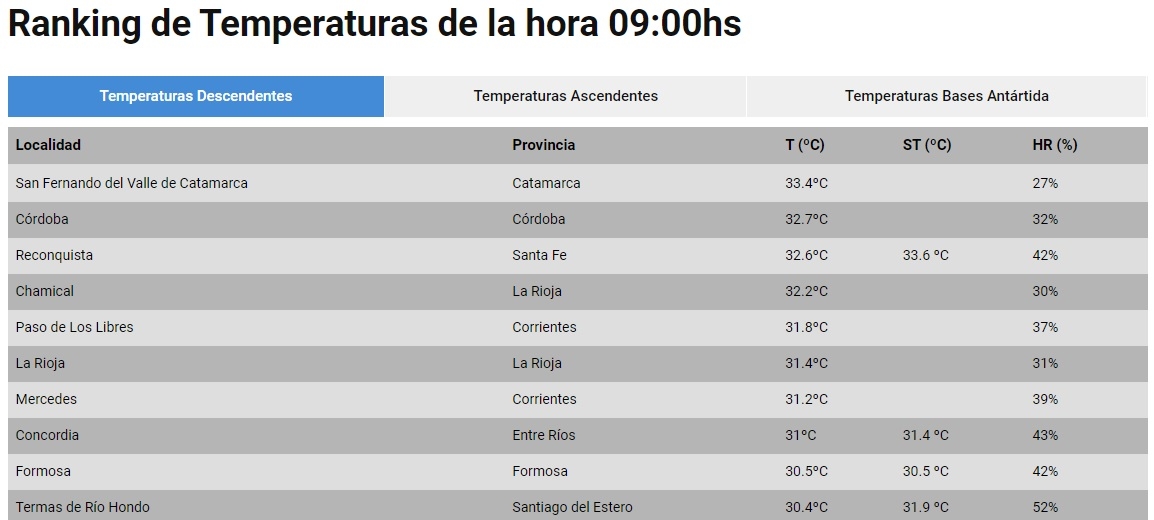 El segundo lugar lo ocupa Córdoba, con 32.7°; y el tercero Reconquista, en Chaco, con 32.6°.