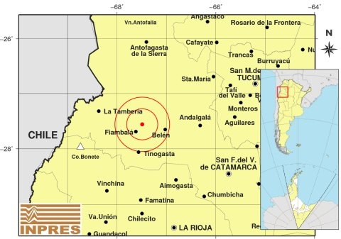 Epicentro: 198 km al NO de San F. Del Valle De Catamarca; 215 km al N de La Rioja; 19 km al NE de Fiambalá -27.559 (lat) -67.490 (long)