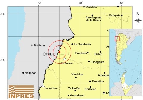 Epicentro: 286 km al NO de La Rioja; 331 km al O de San F. Del Valle De Catamarca; 71 km al SO de La Tambería -27.660 (lat) -68.984 (long)