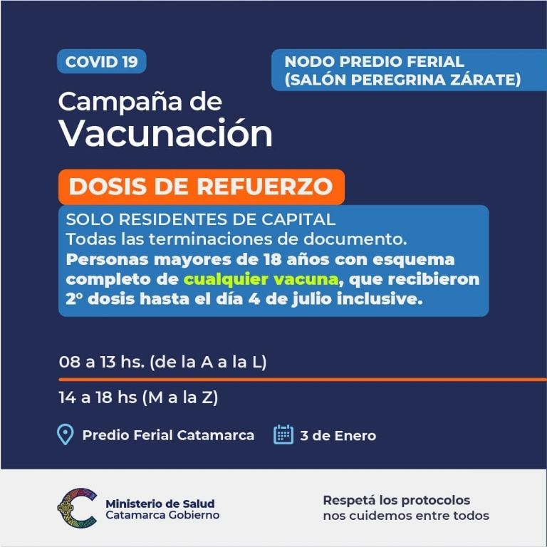 Predio Ferial Catamarca. Personas mayores de 18 años con esquema completo de cualquier vacuna, que recibieron 2° dosis hasta el día 4 de julio inclusive. 8 a 13 hs. (de la A a la L) 14 a 18 hs (M a la Z) Todas las terminaciones de documento. Sólo residentes de Capital.