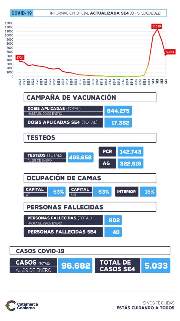 El COE comunica que se llevan procesados 142.743 test PCR y 322.915 test de Antígenos en Catamarca. Es decir, que en la Provincia se realizaron desde el inicio de la pandemia 465.658 test para detectar COVID-19. De dicha cifra, 8161 test (1251 PCR y 6910 Antígenos) corresponden a la semana epidemiológica Nº4 (23 al 29 de enero).