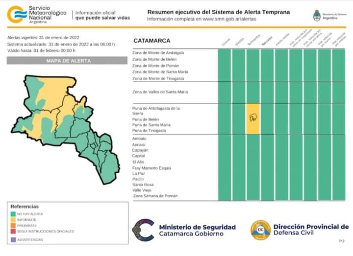 La alerta rige para hoy lunes 31, afectando las zonas de Puna de Santa María, Belén, Tinogasta y Antofagasta de la Sierra.