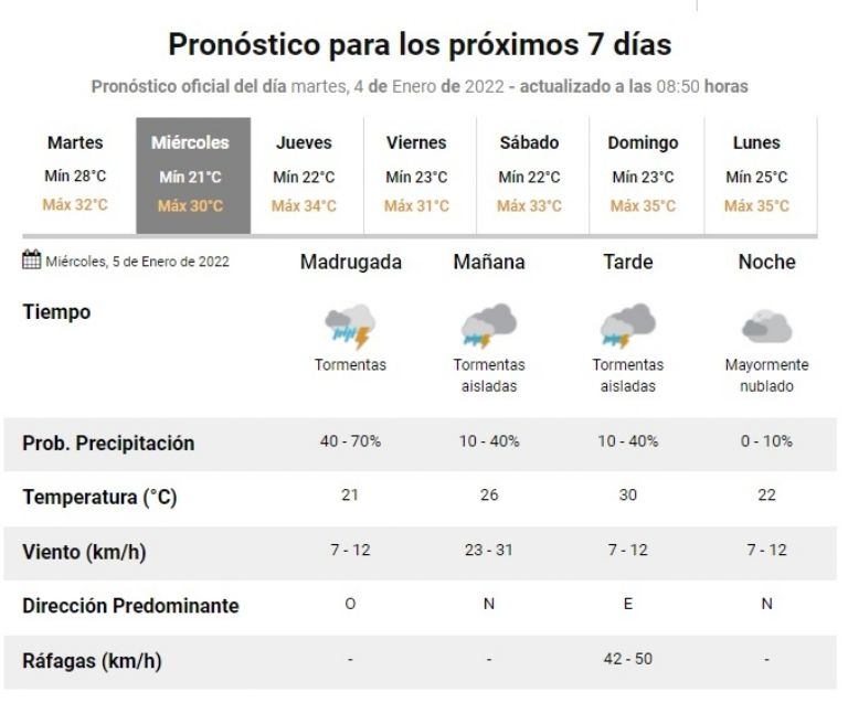 Para el jueves, la mínima será de 22°C y la máxima de 34°C y el día estará parcialmente nublado, sin lluvia a la vista. El viernes volverá la inestabilidad con tormentas aisladas.