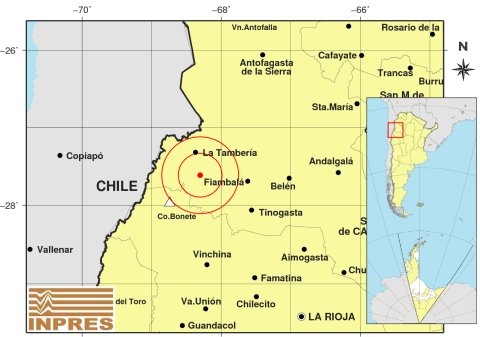 Epicentro: 245 km al NO de La Rioja; 269 km al O de San F. Del Valle De Catamarca; 33 km al S de La Tambería -27.614 (lat) -68.303 (long)